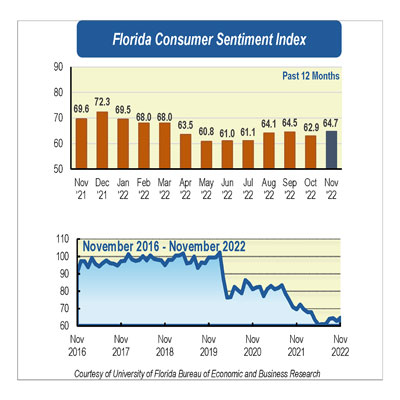 Consumer sentiment among Floridians increased in November to 64.7, up 1.8 points from a revised figure of 62.9 in October. However, national sentiment decreased over three points.